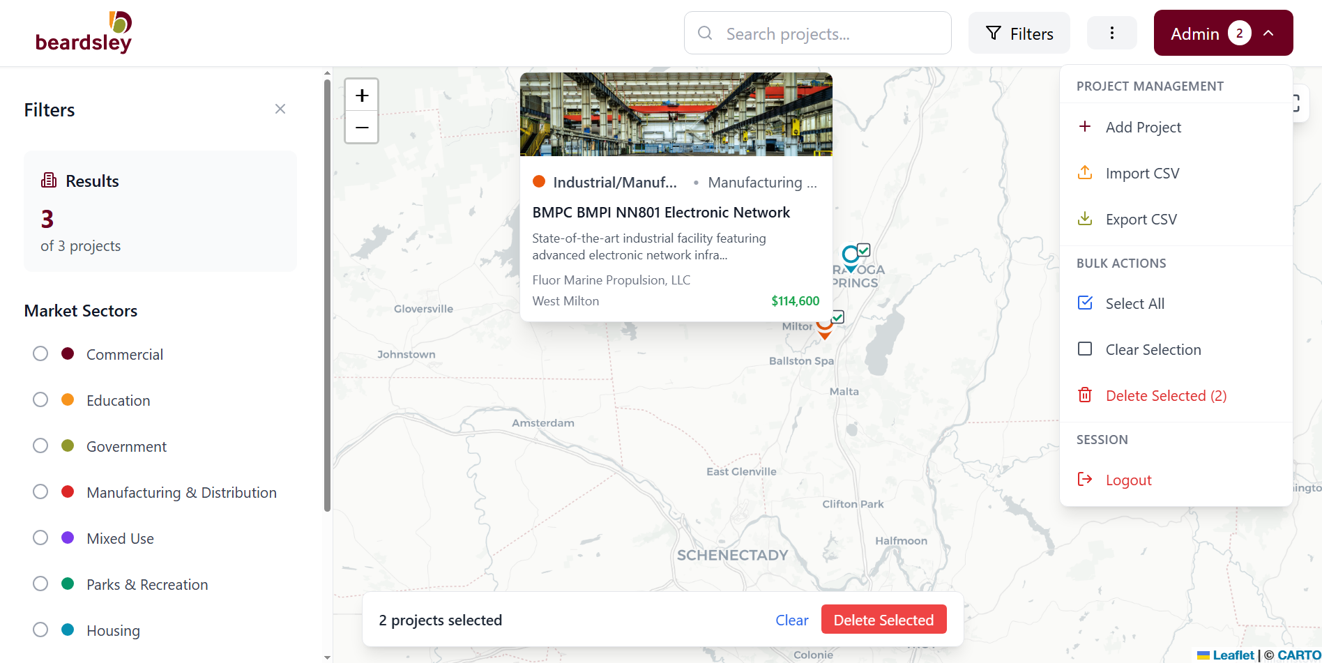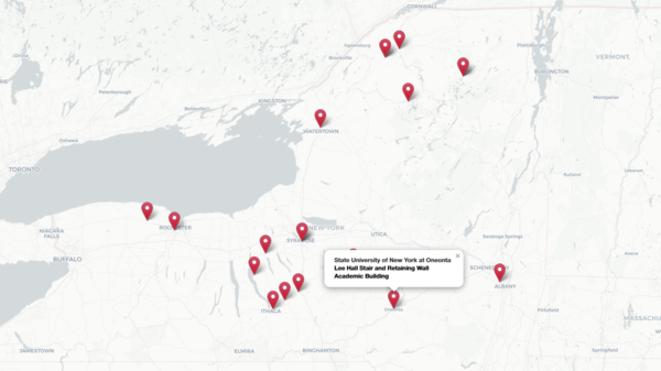 An interactive map portfolio built with Leaflet.js, showcasing Beardsley Architecture & Engineering projects across New York State. Each pin links to a detailed project summary with photos and project details.